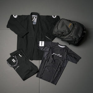 Features a Black Foundation Gi, Black Short Sleeve Foundation Rash Guard, and Black Gatame Backpack.