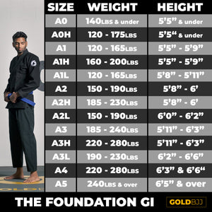 This kit features our Foundation Gi, Foundation Rash Guard, and Gatame Backpack. Please use the size charts below to determine your correct size.