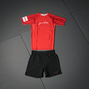 As seen on Mahamed Aly at the Craig Jones Invitational! Save big with the Red Alert bundle, featuring our short-sleeve Foundation Rash Guard in red and our AirFlex Shorts in black.