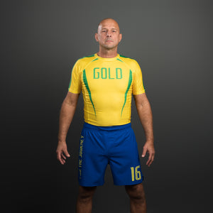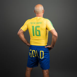The official pro model no-gi kit of Roosevelt Sousa, the Canarinho set is inspired by Brazil’s legendary soccer kits. Pick up the rash guard and shorts together and save on the complete kit.